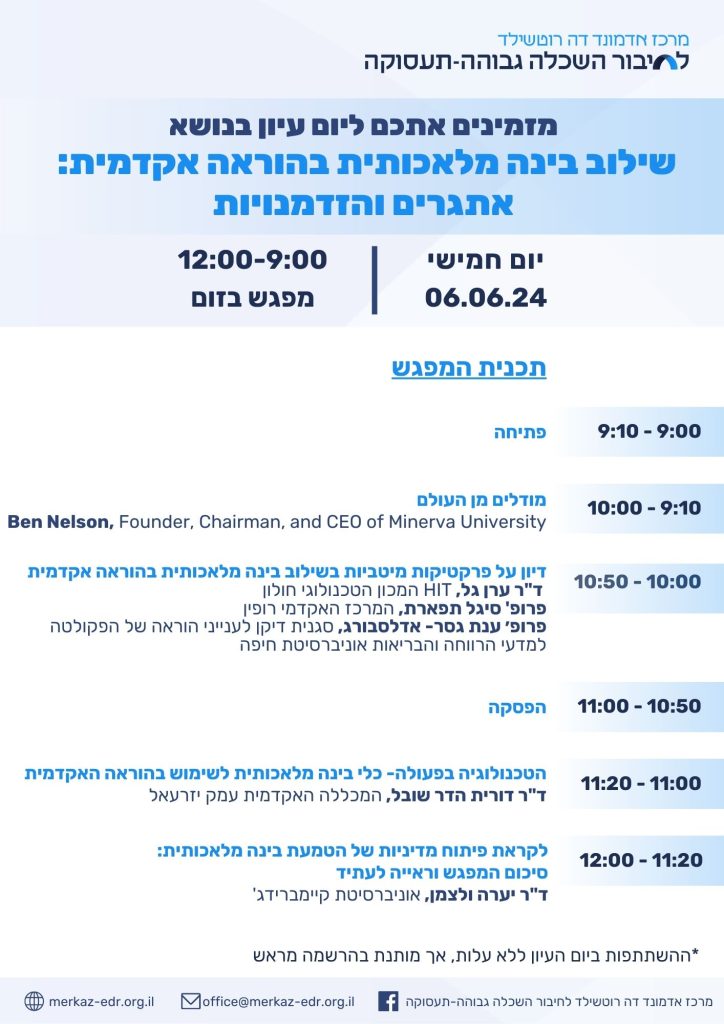 לכן, אנו גאים לספר ש100 אנשי סגל אקדמי ממגוון מוסדות אקדמיה ברחבי הארץ התכנסו והשתתפו ביום עיון שערכנו, בנושא החשוב של שילוב בינה מלאכותית בהוראה אקדמית.